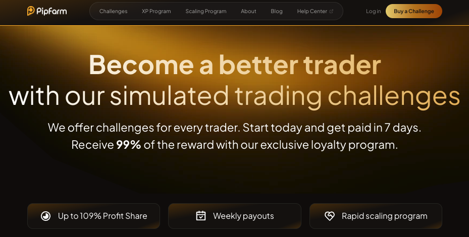 - PipFarm rewards long-term loyalty through its XP system with splits up to 99%.